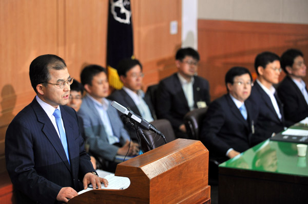 | ▲ 10일 오후 감사원 박시종 행정안보감사국장이 지난 3월에 일어난 천안함 침몰사건과 관련해 군의 대응실태 감사 중간발표를 하고 있다.(뉴시스) | ||
