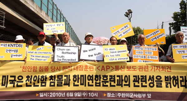 | ▲ 9일 오전 서울 용산 주한미군사령부 5번출구 앞에서 평통사(평화와 통일을 사랑하는 사람들) 관계자들이 천안함 관련 기자회견을 하고 있다. 이날 기자 회견은 평통사 미군문제팀이 'AP통신의 천안함 침몰 당시 한미 대잠훈련 보도'와 관련해 주한 미군과 한국 국방부에 사실관계 규명을 요구하는 취지로 주최했다. (뉴시스) | ||