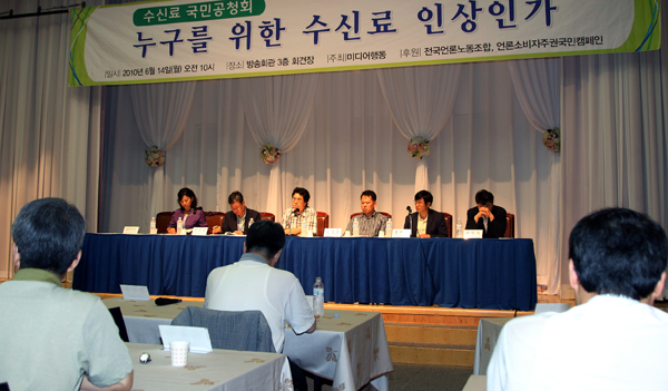 KBS가 현행 수신료 2천500원을 6천500원으로 인상하는 방안을 추진하고 있는 가운데 언론사유화 저지 및 미디어공공성 확대를 위한 사회행동은 14일 오전 서울 목동 방송회관에서 ‘수신료 국민공청회-누구를 위한 수신료 인상인가’를 열었다.