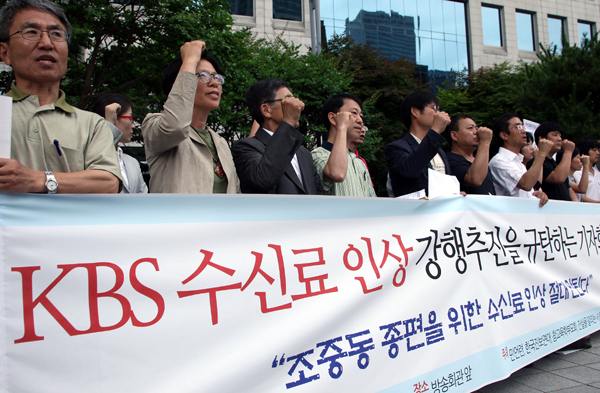 ▲ KBS 수신료 현실화 공청회가 열린 14일 오후 서울 목동 방송회관 앞에서 민주언론시민연합과 사회시민단체 회원들이 KBS 수신료 인상 강행추진을 규탄하는 구호를 외치고 있다.(연합뉴스) |