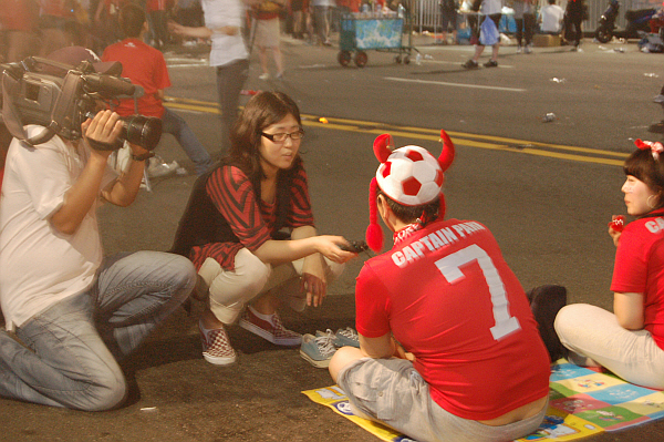 | ▲ 붉은 색 티셔츠를 입은 한 기자가 17일 저녁 시청앞 광장에서 응원을 나온 시민들을 취재하고 있다. | ||