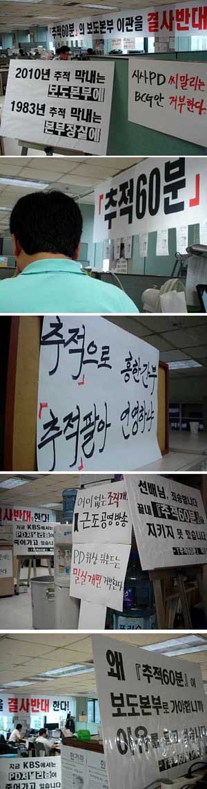 ▲ KBS가 PD들의 반발에도 불구하고 ‘추적 60분’을 보도본부로 이관시켰다. ‘추적 60분’ 사무실에 이관을 반대하는 현수막과 손팻말이 보인다.(언론노조 KBS본부 제공) |