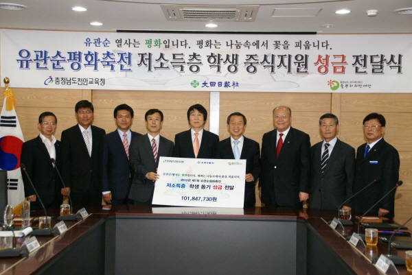 대전일보와 (재)풀뿌리희망재단은 ‘제 7회 유관순평화축전’을 통해 모금된 1억1백84만여원을 결식아동 급식 지원비로 천안시교육청에 전달했다.