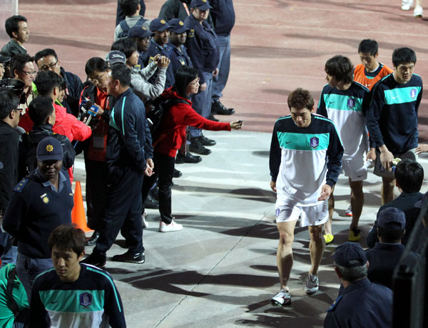 ▲ 그리스와의 1차전을 앞둔 지난 11일(한국시간) 새벽 남아프리카공화국 포트엘리자베스 겔반데일 스타디움에서 열린 한국대표팀 훈련에서 박주영이 훈련을 마친 뒤 취재진의 질문에 별 대답없이 스타디움을 나서고 있다. (연합뉴스) |