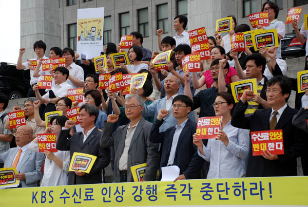 “사회적 동의 절차 구해야”KBS의 수신료 인상은 초기부터 강한 저항에 부닥치고 있다. 사회적 동의를 구하지 않고 일방 추진되고 있는 데다 ‘조·중·동 종편 지원’을 위한 인상이라는 태생적 한계 때문이다. 지방선거에서 민심의 무서움을 확인한 여당도 밀어붙이기식 인상안 처리에 부담스러울 수밖에 없다. 2007년에도 수신료를 월 4천원으로 인상하는 방안이 국회에 제출됐으나 당시 야당인 한나라당의 반대로 무산됐다.