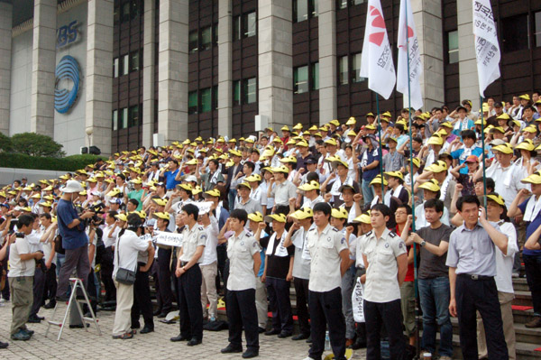 한낮의 뙤약볕도 KBS 새 노조의 ‘공정방송 사수’ 열기를 꺾지 못했다. KBS 새 노조인 전국언론노조 KBS본부 조합원 6백여명은 1일 오후 서울 여의도 KBS 본관 계단 앞에서 ‘KBS를 살리겠습니다’ 손 펼침막을 흔들면서 총파업 시작을 알렸다.