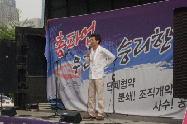 김영훈 민주노총 위원장은 “KBS는 사회 감시 임무를 방기하고 노조를 억압하는 방송을 하고 있다. 정권의 나팔수가 되라고 국민들이 KBS에 임무를 준 적이 없다”며 “공영방송 KBS를 원래 자리로 돌려놔야 한다”고 말했다.