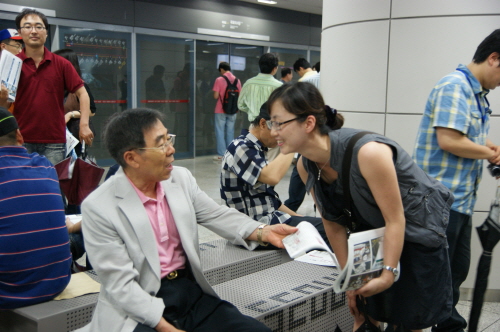 ▲ 정세진 아나운서가 지하철 역에서 KBS 새노조 파업의 정당성을 설명하고 있다. <전국언론노조 KBS본부 제공> |