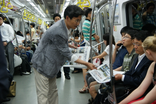 ▲ 엄경철 KBS 새 노조 위원장이 지하철 안에서 시민들에게 파업 전단을 나눠주고 있다. <전국언로노조 KBS 본부 제공> |