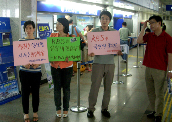 | ▲ 6일 오전 전남 목포시 목포역 대합실에서 전국언론노동조합 KBS본부 광주전남지부 조합원들이 공영방송 사수를 주장하며 시위를 벌이고 있다.(뉴시스) | ||