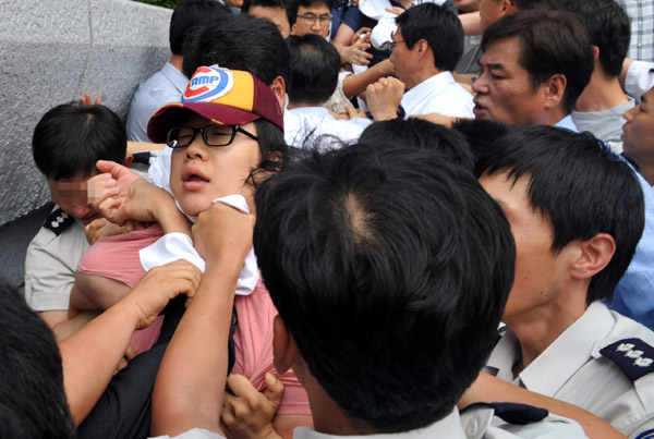 | ▲ 지난 1일 오전 서울 여의도 KBS 본관앞에서 총파업 출정식을 가지려는 KBS노조원들과 이를 저지하려는 청원경찰들이 몸싸움을 벌이고 있다.(뉴시스) | ||