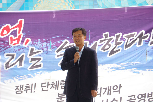 | ▲ 한국기자협회 우장균 회장이 12일 여의도 KBS 신관 계단에서 열린 파업 결의대회에서 연대사를 하고 있다. 우 회장은 “1천여명의 조합원들이 KBS의 새 역사를 쓰기 위해 투쟁하고 있다”고 말했다. | ||