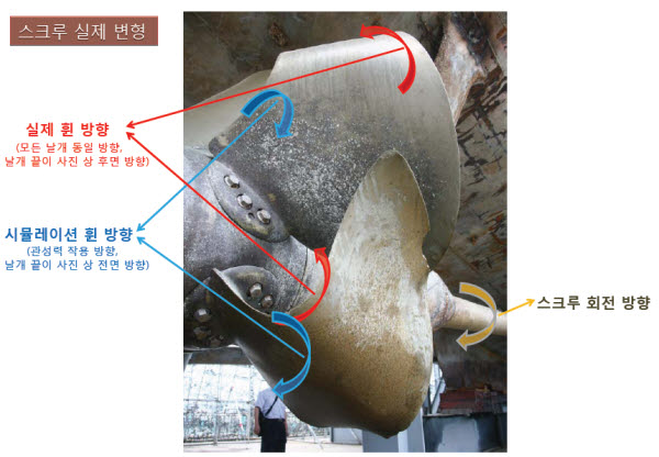 시뮬레이션 상에는 스크루는 배 뒷면에서 볼 때 안 쪽으로 휘었으나, 실제 스크루는 바깥 쪽으로 휜 것으로 나타났다.