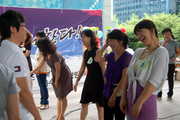 ▲ 12일 열린 미혼남녀 조합원들의 짝을 찾아주는 ‘사랑의 개념광장’ 이벤트는 폭발적 반응을 일으켰다. 참가자들이 맞선을 앞두고 서로 인사를 나누면서 환하게 웃고 있다. |
