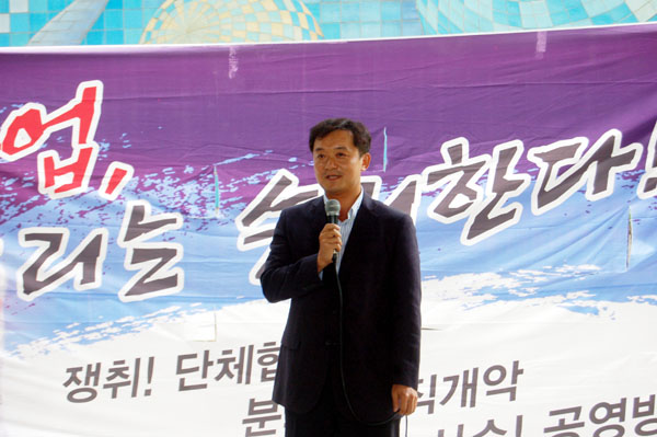 ▲ 한국기자협회 우장균 회장이 12일 여의도 KBS 신관 계단에서 열린 파업 결의대회에서 연대사를 하고 있다. 우 회장은 “1천여명의 조합원들이 KBS의 새 역사를 쓰기 위해 투쟁하고 있다”고 말했다. |