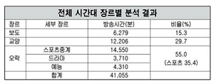 이 중 SBS는 스포츠중계·드라마·예능 등 오락프로그램에 2만2천5백70분(55%)을 사용했으며 보도에는 6천2백79분(15.3%), 교양 프로그램에는 1만2천2백6분(29.7%)을 할애하는 데 그쳤다.