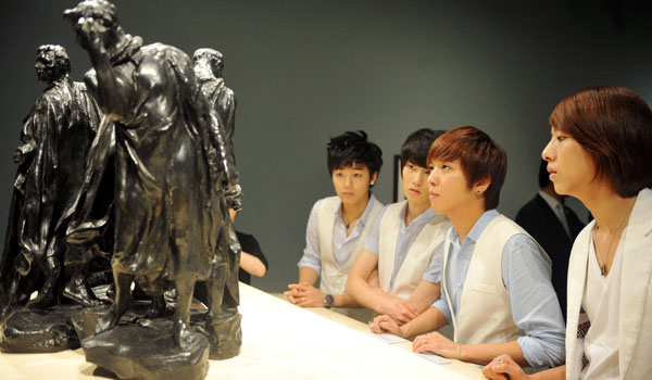▲ 그룹 씨엔블루가 9일 서울 중구 서울시립미술관에서 전시되고 있는 ‘신의 손-로댕 특별전’을 관람하고 있다. (한국일보 제공) |