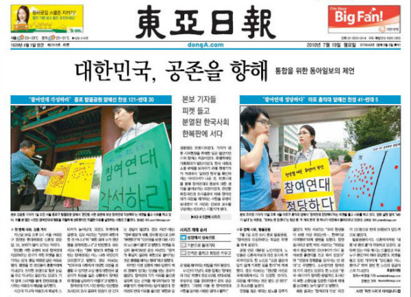 동아일보가 이색적인 기획을 마련해 눈길을 끌고 있다. 19일자부터 3부 예정으로 시작된 ‘대한민국, 공존을 향해-통합을 위한 동아일보의 제언’이 그것이다.