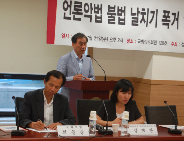 | ▲ 21일 국회 의원회관에서 열린 '언론악법 날치기 1년 대토론회'에서 정장선 민주당 의원이 인사말을 하고 있다. | ||