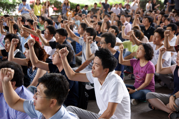 ▲ 3일 서울 여의도 KBS 신관 계단에서 열린 ‘임단협 재개 출정식 및 보복인사 규탄 결의대회’에서 KBS 새 노조 조합원들이 최근 사측이 파업 참가자들을 방송에서 배제한데 대해 규탄하고 있다. (KBS 새 노조 제공) |