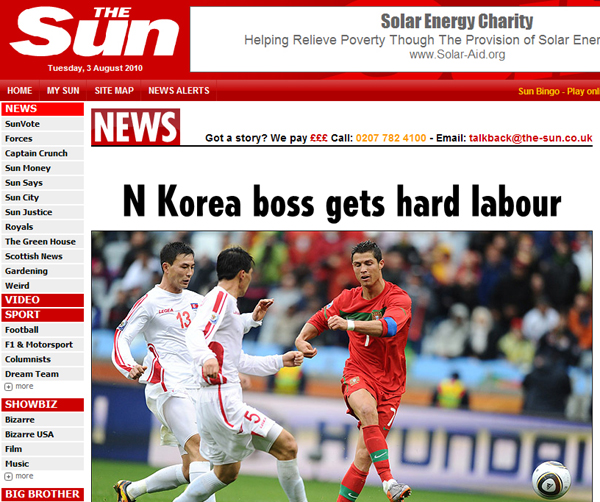 ‘더선’은 지난달 30일 “북한대표팀이 포르투갈과의 월드컵 본선 조별리그 경기서 0-7로 대패해 김정일 총서기의 노여움을 샀다”면서 “김 감독이 강제 노역에 시달리고 있다”고 보도했다.