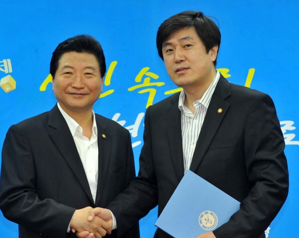 ▲ 5일 여의도 한나라당사에서 열린 신임 당직자 임명장 수여식에서 안형환 신임 대변인(오른쪽)이 안상수 대표와 악수하고 있다. |