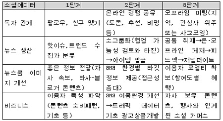 | ▲ 소셜에디터는 SNS 이용자의 기호와 니즈를 파악하는 것을 비롯 단계별 전략을 추진한다. 이 과정에서 뉴스룸의 모든 종사자들이 소셜에디터의 업무를 지원한다. 소셜에디터의 업무가 뉴스룸의 경쟁력과 연결돼 있기 때문이다. | ||