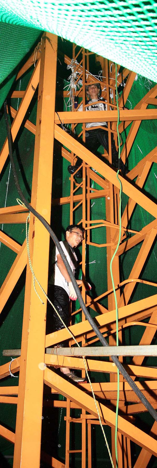 | ▲ 4대강정비사업 중단을 촉구하며 이환문(42) 진주환경연합 사무국장과 최수영(아래, 40) 부산환경연합 사무처장이 경남 창녕군 길곡면 낙동강 함안보 타워크레인에 올라가 고공농성을 벌인 지 20일째인 10일 저녁 타워크레인에서 내려오고 있다.(뉴시스) | ||