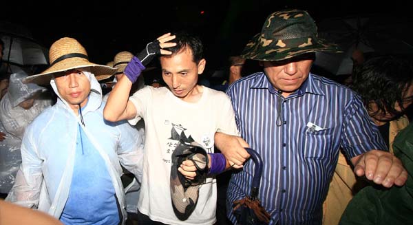 | ▲ 이환문 진주환경연합 사무국장이 10일 저녁 타워크레인에서 내려와 경찰에 연행되고 있다.(뉴시스) | ||