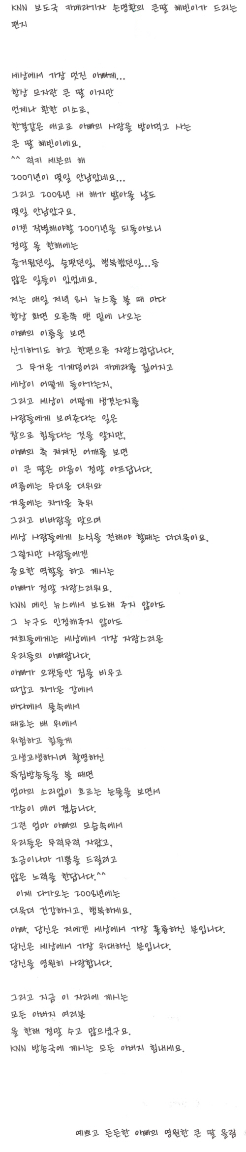 | ▲ 故 손명환 기자 딸 혜빈양이 2007년 쓴 편지글. | ||