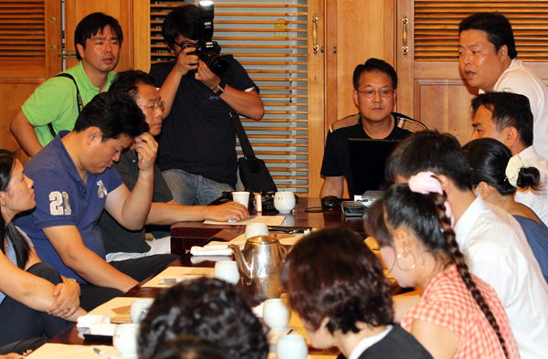 | ▲ 천안함46용사유족협의회 이인옥 대표(오른쪽 두번째)와 이정국(오른쪽) 자문위원, 천안함 희생자 유가족 20여명이 15일 오후 서울 중구의 한 음식점에서 기자회견을 열고 천안함 유족과 관련해 부적절한 발언을 한 조현오 경찰청장 내정자의 즉각적인 공개 사과와 청장 후보 사퇴를 요구하는 입장을 발표하고 있다. (연합뉴스) | ||