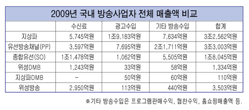 방송통신위원회가 최근 발간한 ‘2009 방송사업자 재산상황 공표집’에 따르면 지난해 지상파는 전체 방송매출 점유율에서 36.8%를 기록, 37.3%의 점유율을 보인 케이블PP에 처음으로 추월 당했다.
