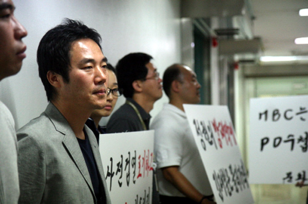 | ▲ PD수첩 ‘4대강’ 편 방송 보류 결정이 내려진 17일 밤 이근행 노조위원장 등 노조 관계자들이 10층 사장실 앞에서 항의 농성을 벌이고 있다. | ||
