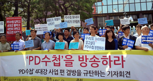 | ▲ 민주언론운동시민연합과 언론연대, 환경운동연합 등 소속 회원 50명이 18일 오전 서울 여의도 MBC 앞에서 기자회견을 열고 'PD수첩'-4대강 수심 6m의 비밀'의 방송을 촉구하고 있다. (연합뉴스) | ||