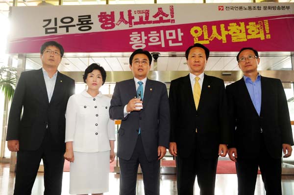 | ▲ 전병헌 의원 등 민주당 의원들이 18일 오후 여의도 MBC를 항의 방문하고 있다. 왼쪽부터 이춘석, 전혜숙, 전병헌, 조영택, 홍영표 의원.(뉴시스) | ||