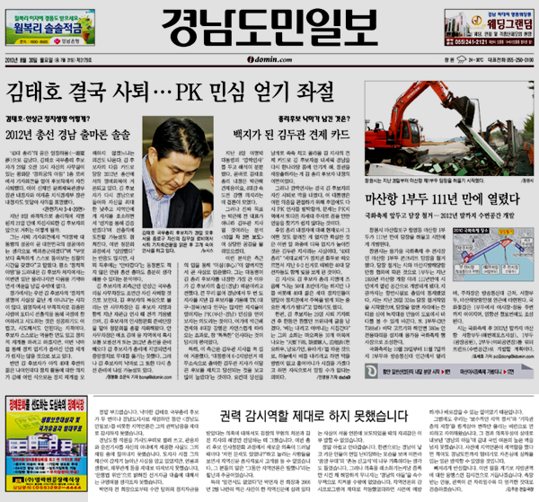 경남도민일보는 지난달 30일 김주완 편집국장 명의로 ‘권력 감시역할 제대로 하지 못했습니다’라는 제목의 글을 게재했다. 이 글에서 경남도민은 “정말 부끄럽다. 낙마한 김태호 국무총리 후보가 두 번이나 경남지사로 재임하던 동안 경남도민을 비롯한 경남지역 언론은 그의 권력 남용을 제대로 감시하지 못했다”고 밝혔다.