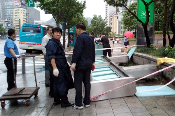 ▲ 서울신문 직원들이 2일 태풍 ‘곤파스’의 영향으로 파손된 신문 게시대를 치우고 있다.