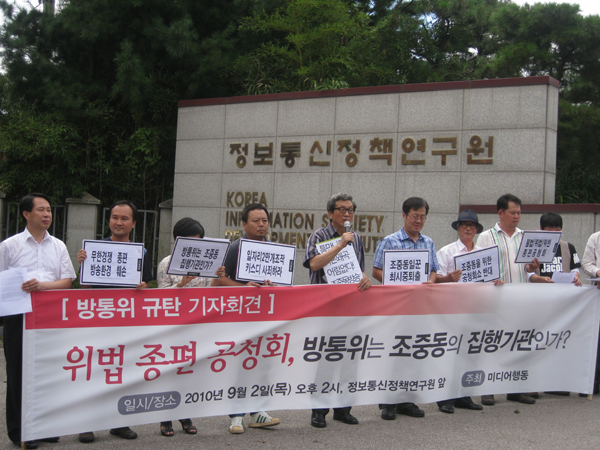 한편 미디어행동은 이날 정보통신정책연구원 앞에서 기자회견을 열고 “모법이 불법이면, 불법에 뿌리를 둔 시행령도 불법이고, 시행령이 불법이면 관련 정책 집행도 불법”이라며 “거짓과 부정, 불법과 위법으로 점철된 조중동 세상 만들기의 꿈, 호언컨대 끝내 이루지 못할 것”이라고 밝혔다.