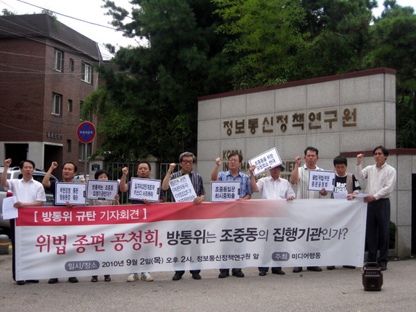 ▲ 미디어행동이 2일 정보통신정책연구원 앞에서 공청회 규탄 기자회견을 하고 있다.