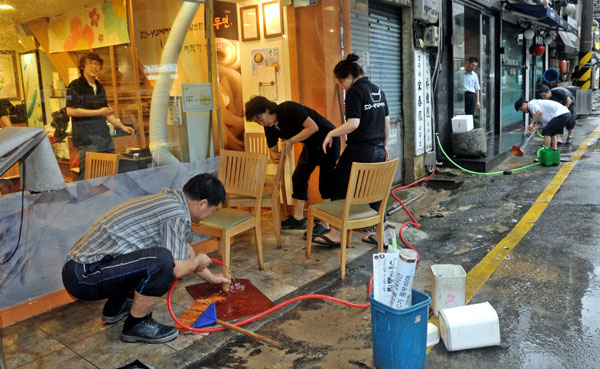 | ▲ 21일 오후 서울을 비롯한 중부지방에 호우주의보가 발령된 가운데 광화문 사거리 주변이 침수, 상점 관계자들이 식기도구들과 의자들을 정리하고 있다.(뉴시스) | ||