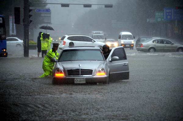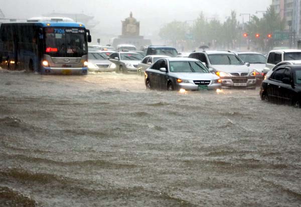 | ▲ 집중호우로 물바다가 된 광화문 일대에서 한 차량이 멈춰서 긴급 대피하고 하고있다.(뉴시스) | ||