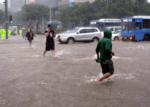 | ▲ 집중호우로 물바다가 된 광화문 사거리에서 시민들이 빗물을 헤치며 길을 건너고 있다.(뉴시스) | ||