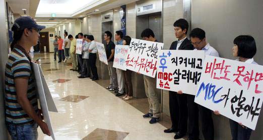 ▲ MBC 기자회 및 시사교양국 비상대책위 소속 기자와 PD들이 지난 16일 오후 서울 여의도 본관 10층 임원실 앞에서 경영진의 '후플러스'와 'W' 폐지 움직임을 비판하는 침묵시위를 벌이고 있다.(MBC 노조 제공) |