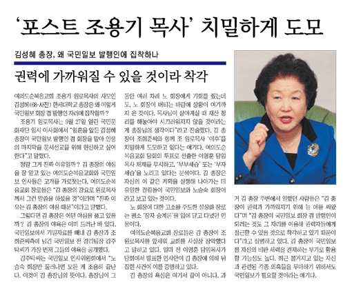 한편 한국기자협회(회장 우장균)는 4일 성명을 통해 “김 총장이 국민일보를 장악하기 위해 언론사 회장을 강제적으로 사퇴서를 쓰게 하는 등 온갖 월권행위를 하는 데에 우려를 금할 수 없다”며 “김 총장과 조희준씨는 더 이상 언론사를 개인 회사로 보는 우를 범하지 말길 바란다”고 경고했다.