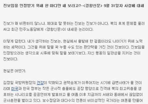 반면 시사평론가 유창선씨는 10일 자신의 블로그에 ‘경향의 민노당 비판은 진보판 색깔론’이란 글에서 “경향에게는 북한의 권력세습을 당장 비판해야 한다는 급한 마음만 있었지, 남북관계의 앞날을 헤아리는 심모원려(深謀遠慮)의 모습은 없었다”고 지적했다.