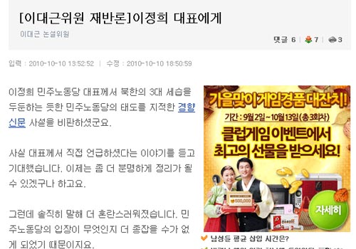또 이 논설위원은 “3대 세습에 관해 가치가 있는 견해는 오직 전략적 판단에 근거한 것뿐이라고 해서는 안됩니다”라며 “바라건대 민노당이 북한 지배세력의 이익 보다 남한 시민들의 이익, 북한 사람들의 이익을 더 중시해주기를 당부한다”고 전했다.