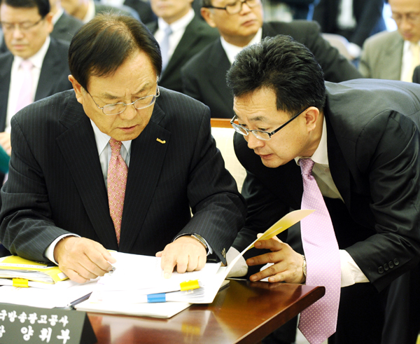 ▲ 12일 오전 서울 프레스센터 19층에서 열린 한국언론재단, 언론중재위원회, 한국방송광고공사 국정감사에서 양휘부 한국방송광고공사 사장이 직원과 자료에 관해 논의하고 있다.(뉴시스) |