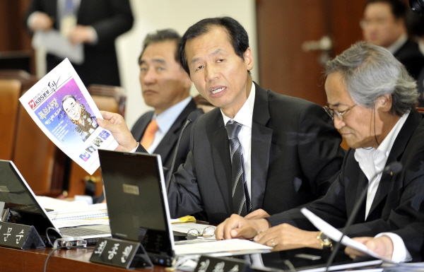 ▲ 민주당 최문순 의원이 18일 국회 문화체육관광방송통신위원회, KBS와 EBS에 대한 국정감사에서 김인규 KBS 사장에게 질의를 하고 있다. (뉴시스) |