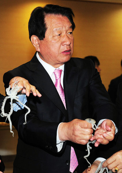 | ▲ 20일 오후 서울 성동구청 구내식당에서 열린 '산낙지 시식회'에서 고재득 성동구청장이 낙지를 산 채로 먹고 있다. (뉴시스) | ||