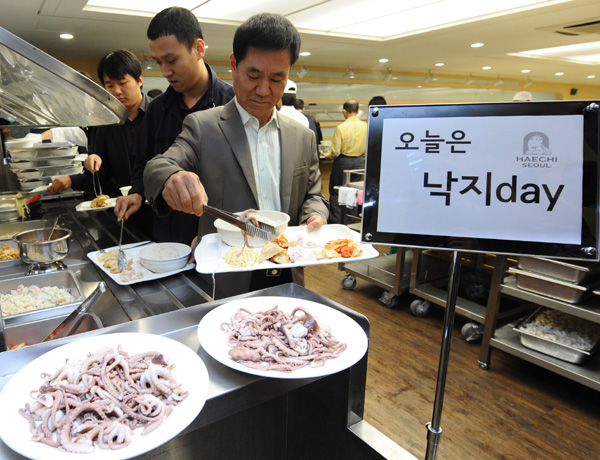 | ▲ 20일 오후 서울 서소문 서울시청 구내식당에서 열린 '낙지데이' 행사에서 직원들이 낙지 비빔밥으로 점심 식사 배식을 받고 있다. (뉴시스) | ||